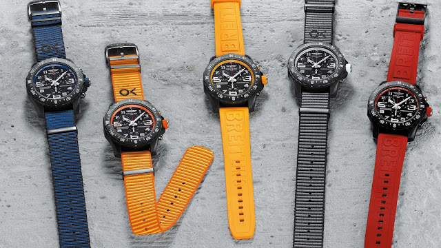 Le faux Breitling Endurance Pro est le successeur spirituel de la réplique de la Breitling Sprint, un chronographe produit dans les années 1970 qui comportait un boîtier en résine et une échelle de pulsomètre. L'échelle du pulsomètre pourrait, en théorie, aider les athlètes à prendre leurs propres mesures du rythme cardiaque. Cette caractéristique se retrouve dans l'Endurance Pro moderne, tout comme l'utilisation d'un matériau non conventionnel pour le boîtier. L'Endurance Pro est fabriqué à partir de Breitlight, qui a été introduit en 2016. Il est 3.3 fois plus léger que le titane et 5.8 fois plus léger que l'acier inoxydable, ce qui le rend idéal pour les applications sportives, mais il est également intéressant du point de vue de la science des matériaux. Il est hypoallergénique, légèrement texturé, et Breitling rapporte qu'il est "plus chaud au toucher que le métal". Bien que le boîtier soit noir, la montre est disponible en cinq couleurs : blanc, bleu, jaune, orange et rouge. Elle est livrée sur un bracelet en caoutchouc coloré, mais les bracelets ECONYL OTAN connus de l'extérieur peuvent être achetés chez Breitling.